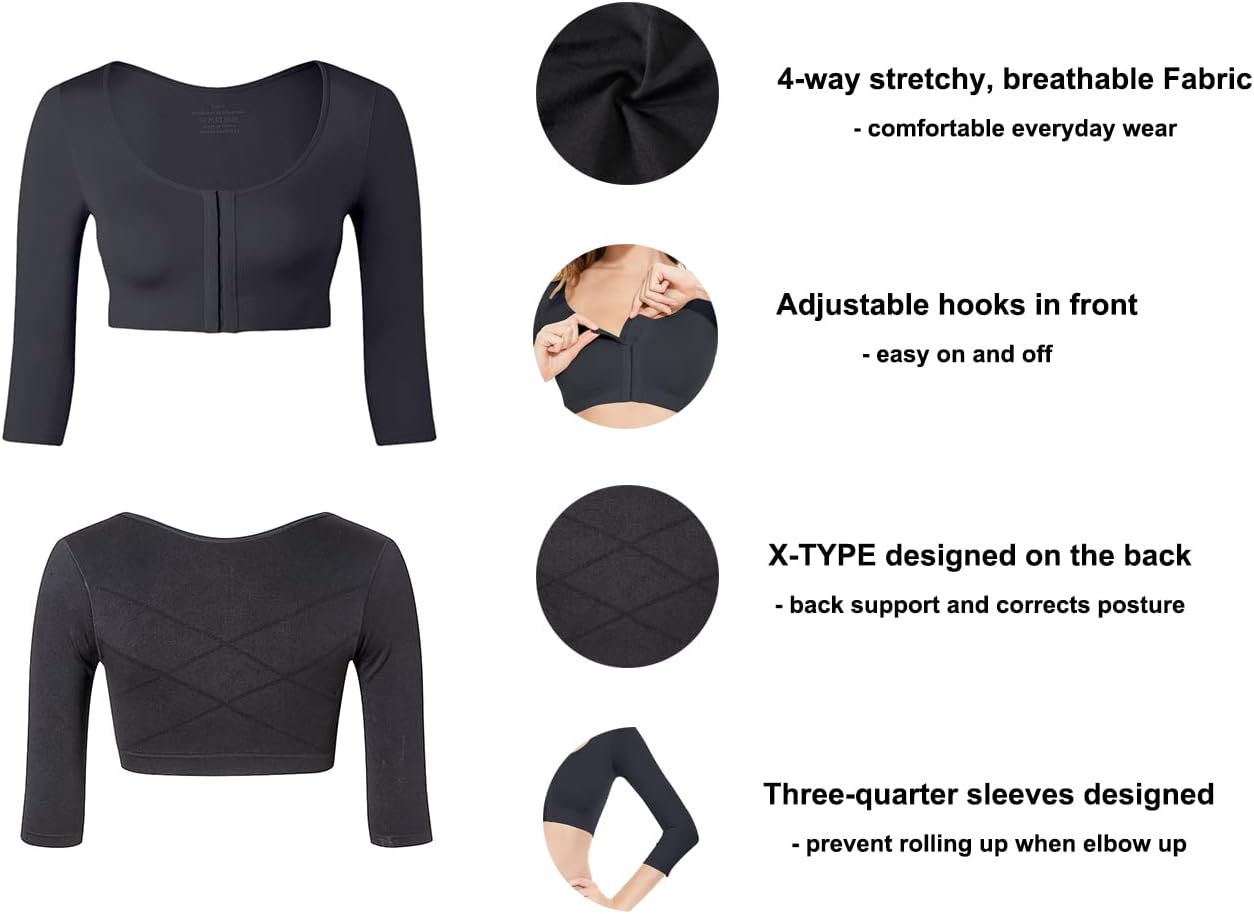 With a front closure system, lightweight design, and 3/4 sleeve length, this garment supports your upper without restricting movement. It’s ideal for daily wear, layering, and post-surgery care.