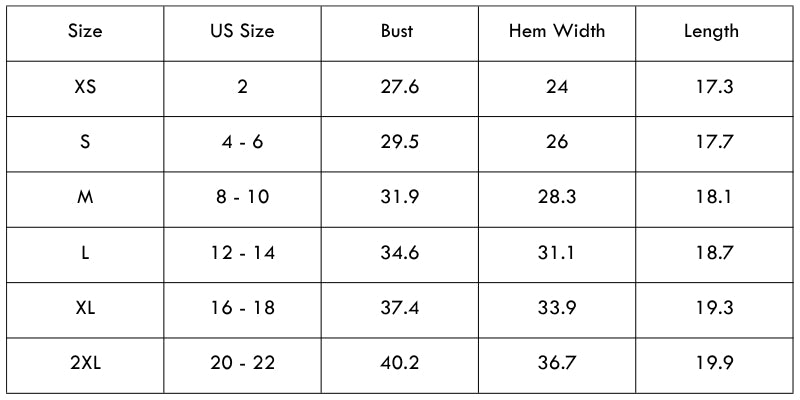 Size Chart (inches):