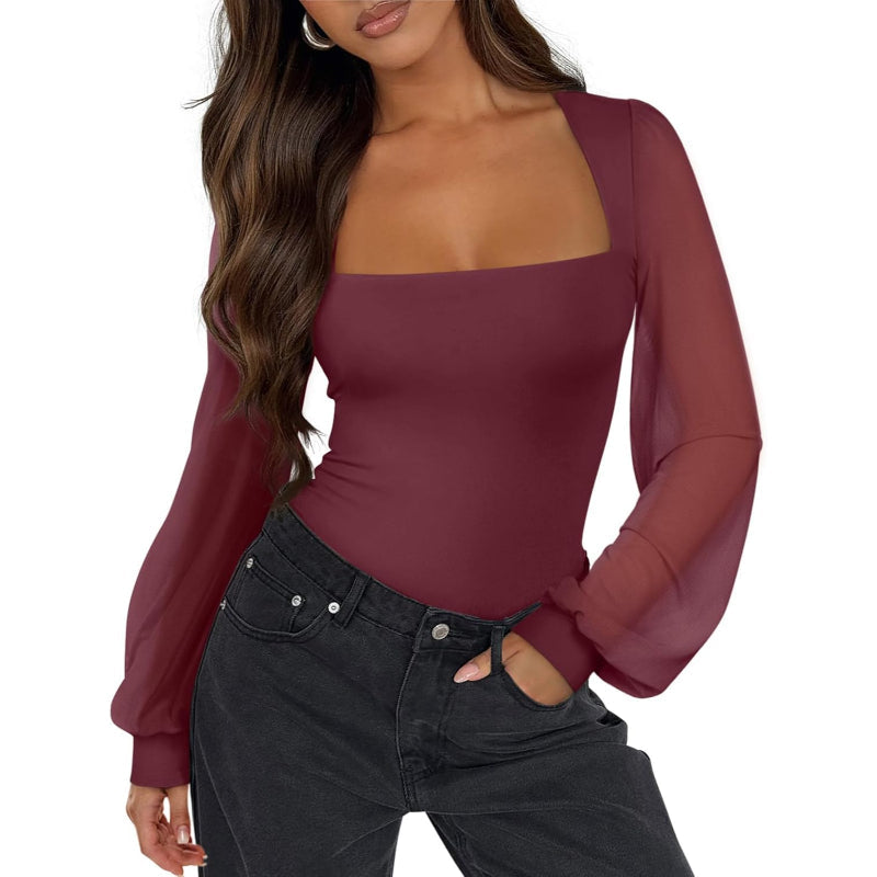 The mesh long sleeve bodysuit is a stylish, functional addition to any wardrobe. Designed with a square-neck bodysuit shape and mesh puff sleeve bodysuit detail, this piece balances elegance with comfort. It flatters the body with a slim fit bodysuit cut while offering flexibility and style in every movement.