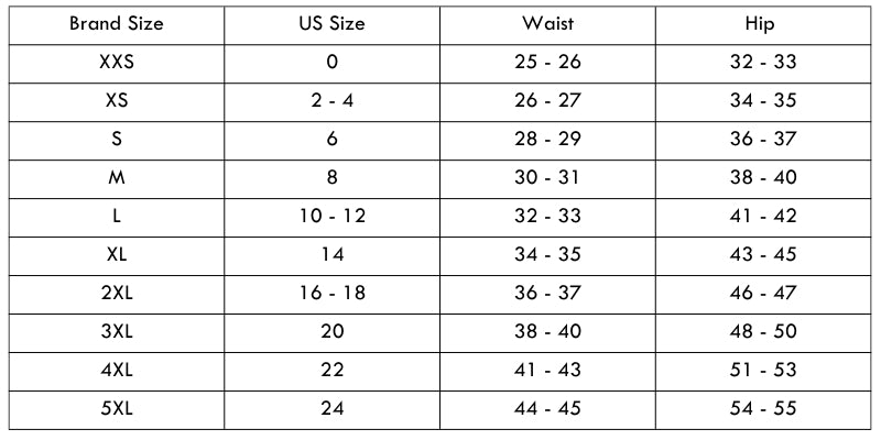 Size Chart (inches):