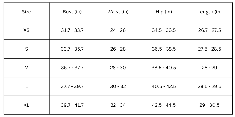 Size Chart (inches):