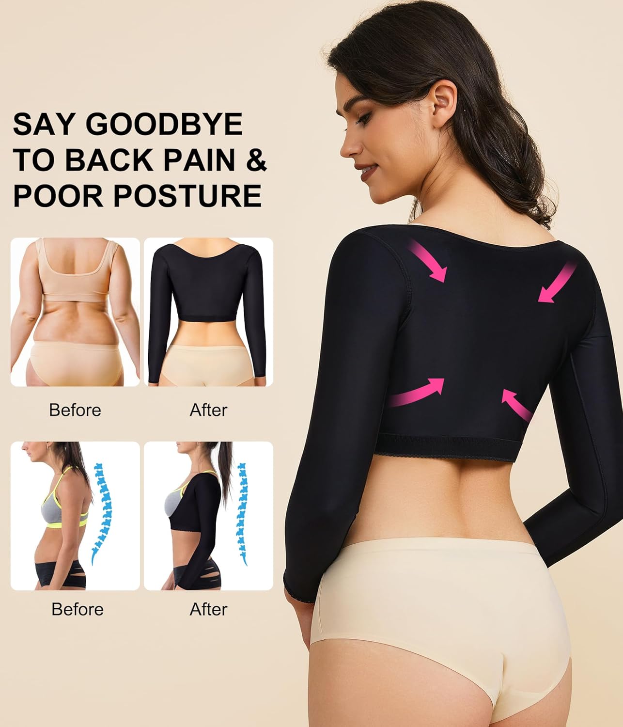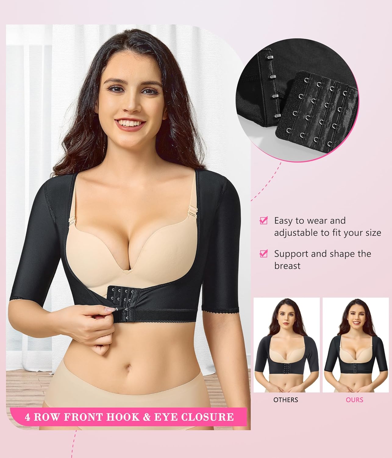 - Its adjustable fit, front closure, and soft fabric ensure ease of use and all-day comfort. Add this compression solution to your wardrobe for smoother, better alignment, and confident wear—every single day.