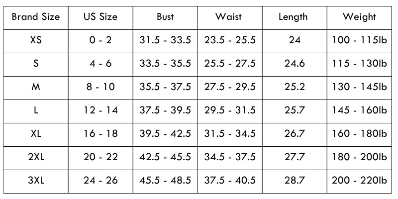 Size Chart (inches):